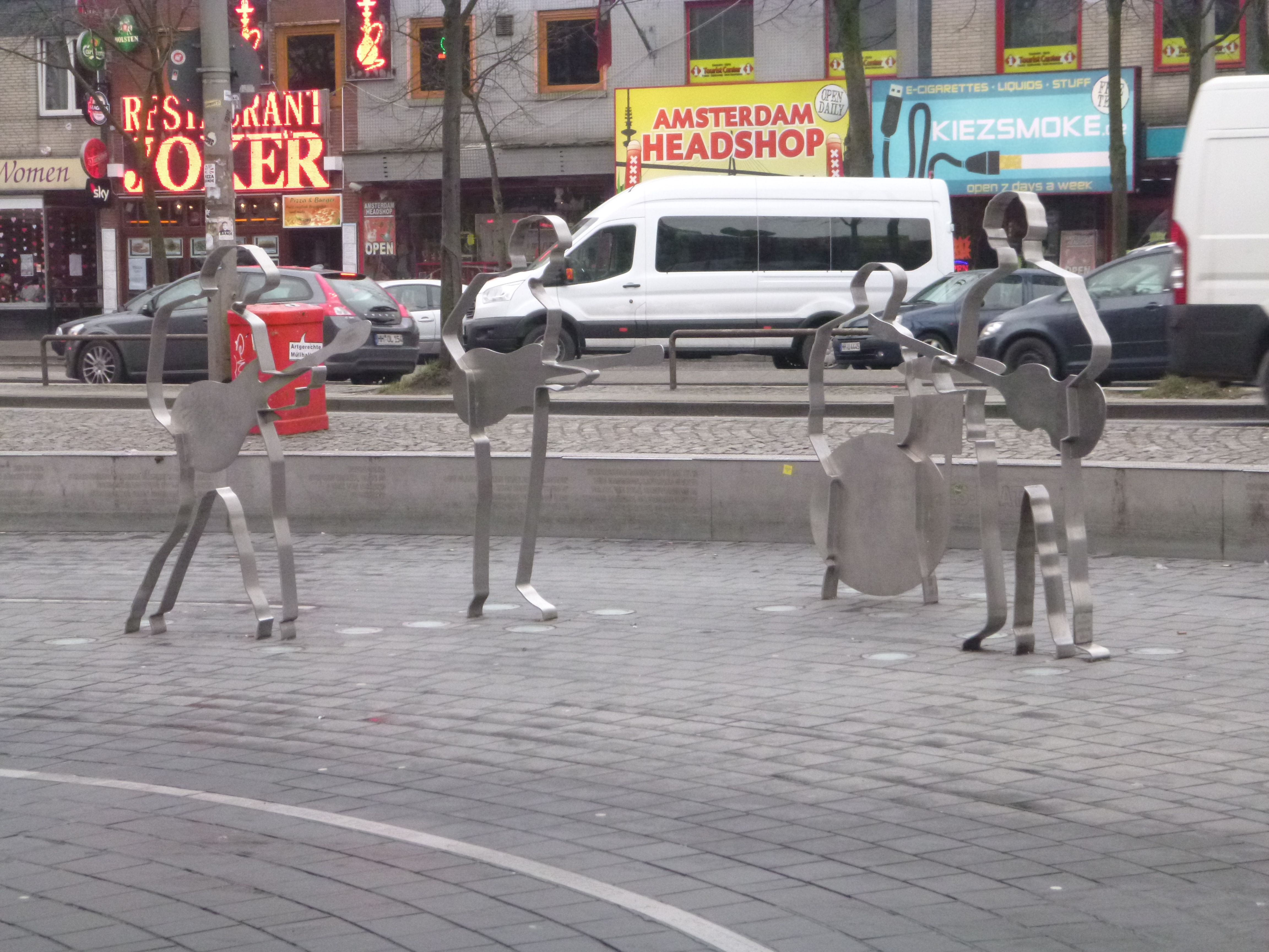 - The Beatles have a record shaped place called the Beatles Platz with artistic statues in the Reeperbahn. I learned later in the evening that the Reeperbahn is pretty much the ‘red light district’ of Hamburg. I had a very interesting night out here where I learned that DJ’s are incapable of finishing a song past the 1st chorus, that pizza is very awesome, and that hangovers are horrible on planes.